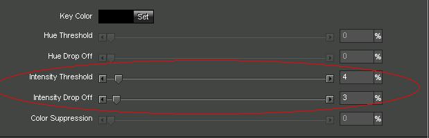 Jesteśmy zaledwie wpół drogi do osiągnięcia celu. Teraz zwróć uwagę na znajdujące się poniżej dwa suwaki: Intensity Threshold (Próg intensywności) oraz Intensity Drop Off (Spadek intensywności). Za pomocą tych dwóch suwaków ustalamy próg i spadek intensywności kluczowanego koloru. Mówiąc prościej te dwa suwaki służą do regulacji skali koloru, który zostanie wymazany z pliku wideo.