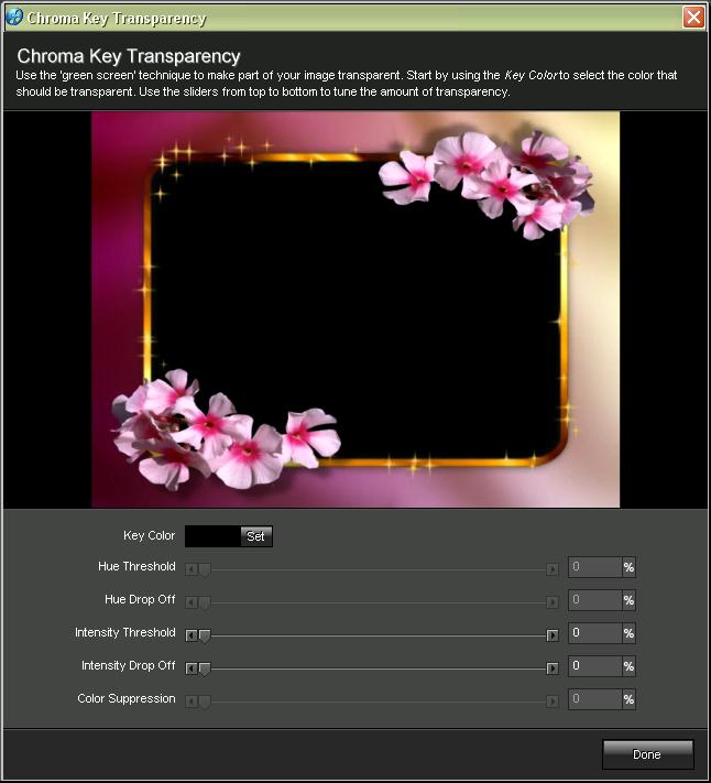 Podregulujmy więc nasz kolor. Wprawdzie zmiany powinny być widoczne w oknie podglądu, lecz ja wolę jednak po każdej regulacji zatwierdzić zmiany klikając przycisk Done (Gotowe) i obejrzeć slajd klikając przycisk Play (Odtwórz). Tu nie warto żałować czasu, bo im bardziej dokładnie wszystko ustawimy, tym lepszy osiągniemy rezultat końcowy. Podpowiem, że w przypadku naszej ramki najlepszymi ustawieniami są: dla Intensity Threshold: 4, a dla Intensity Drop Off: 3.