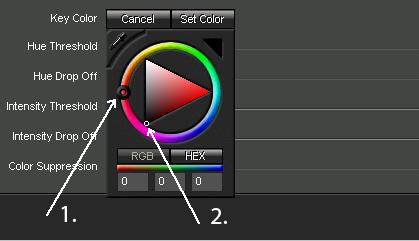 W tym celu klikamy przycisk Set (Ustaw) otwierając paletę kolorów. Możemy teraz ustawić kolor na trzy sposoby. Pierwszy polega na odpowiednim przesunięciu znacznika (1) na zewnętrznym kole palety, by odnaleźć podobny kolor do tego, który chcemy usunąć z pliku wideo. Następnie poruszając znacznikiem (2) wewnątrz trójkąta odnajdujemy odpowiedni kolor.