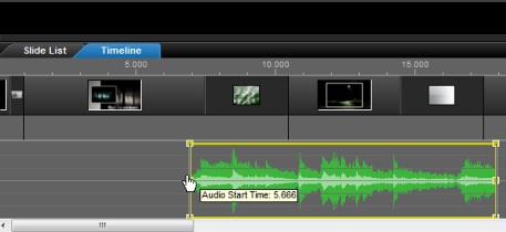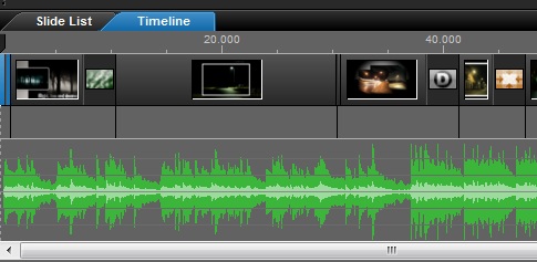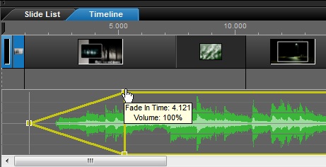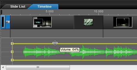 ProShow Producer pozwala na pełną kontrolę nad ścieżką dźwiękową bez korzystania z jakiegokolwiek menu. Znajdująca się w głównym obszarze roboczym oś czasu (Timeline) pozwala dostosować i kontrolować dźwięk obserwując jednocześnie pokaz. Jest to zdecydowanie najszybszy i najprostszy sposób pracy ze ścieżką dźwiękową w pokazie.