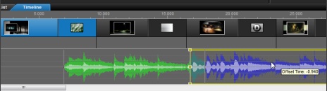 W ProShow Producer można nakładać na siebie dwa różne efekty dźwiękowe. Załóżmy, że będą to dwa różne utwory. Oczywiście może to być para dowolnych efektów dźwięków. W ProShow każdy dodany do ścieżki utwór oznaczany jest naprzemiennie kolorami zielonym i niebieskim. Chcąc „nałożyć” początek drugiego utworu na pierwszy uaktywniamy drugi (niebieski) utwór klikając w jego obrębie i teraz przytrzymując klawisz Ctrl przeciągamy go w lewo do odpowiedniego miejsca.