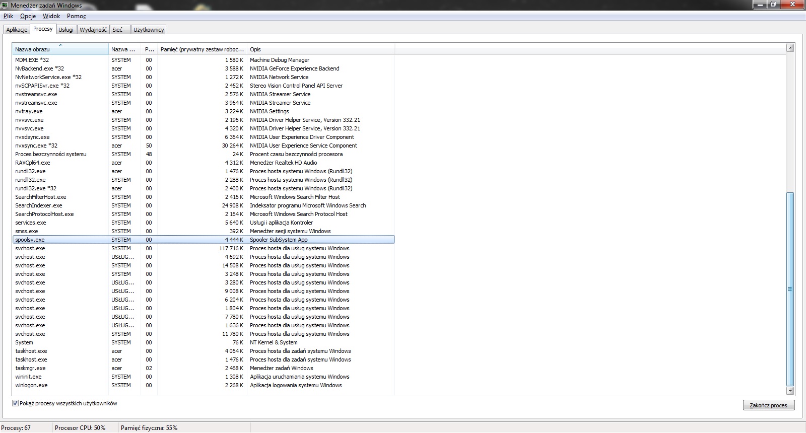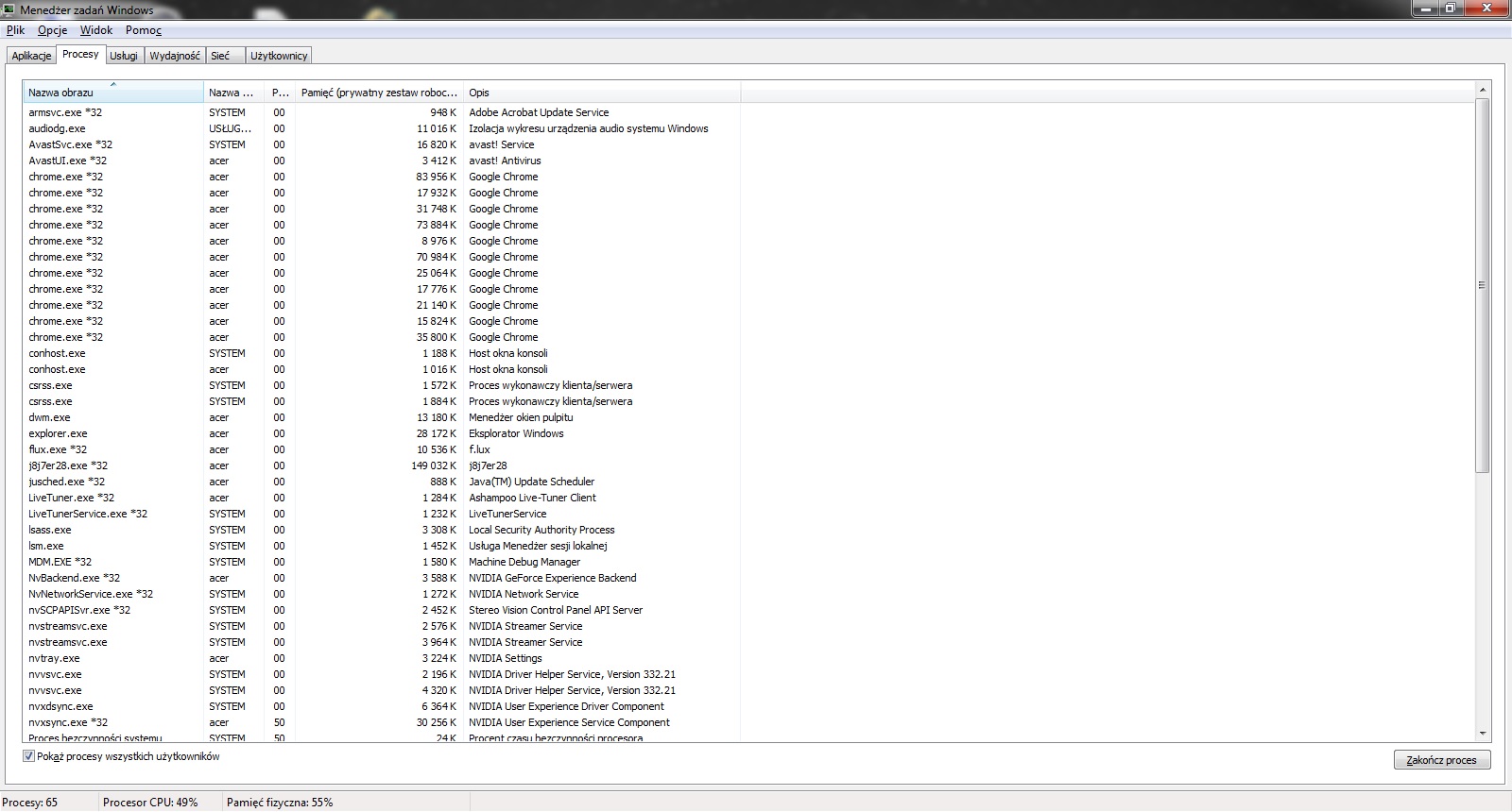 Mam w miarę nowego laptopa, wciąż jestem na etapie instalowania różnych potrzebnych (zapewnie niepotrzebnych też) rzeczy. Dziś zająłem się grami i prawdopodobnie coś nieopatrznie zainstalowałem lub odinstalowałem, gdyż komputer swoją prędkością błaga o szybką śmierć. Od momentu załadowania Win, kupę czasu zajmuje nawet zrobienie kwadratu na pulpicie. Jako, że najwięcej żre svchost.exe, wyłączyłem automatyczne aktualizacje, co nic nie dało. Za chwilę załączę logi i skrin menedżera. Z góry dziękuję za pomoc.