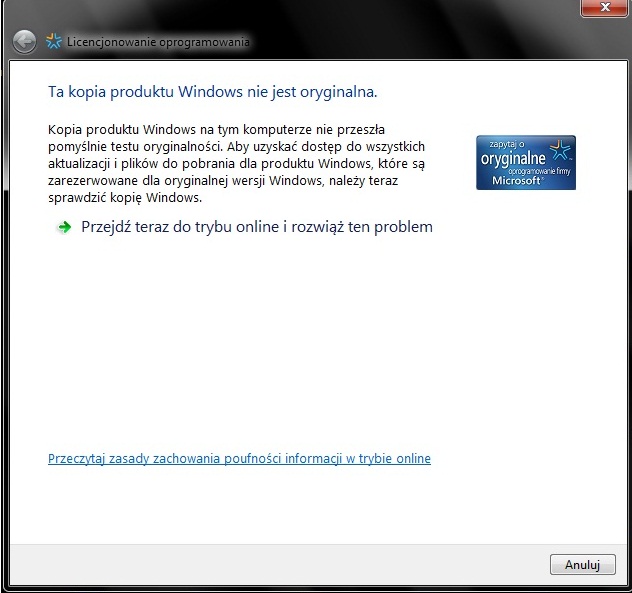 Od kilku dni wyskakuje mi "dymek" na pasku zadan,że mam nie oryginalny produkt windows i pojawia się takie okienko(patrz załącznik) a także przy włączaniu komputera pojawia się bluescreen i numer błędu to : 0xC004F200