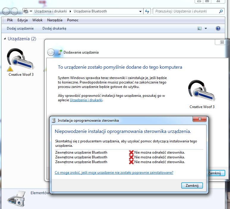 kupiłem creative woof 3 chciałem przez bluetooth podłączyć do laptopa, urządzenie zostało znalezione sterowniki audio zinst. gorzej z sterownikami bluetooth (zamieszczony załącznik ) co zrobić