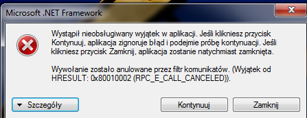 System.Runtime.InteropServices.COMException (0x80010002): Wywołanie zostało anulowane przez filtr komunikatów. (Wyjątek od HRESULT: 0x80010002 (RPC_E_CALL_CANCELED))